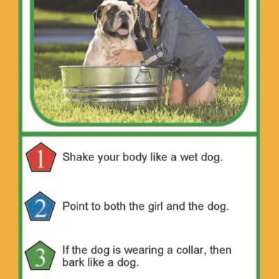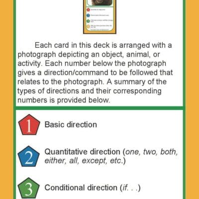 Each 3″ x 5″ card features a photograph and four unique commands, giving students repeated opportunities to follow different types of instructions.