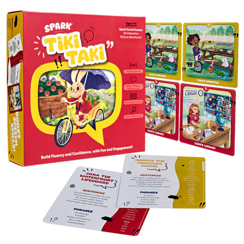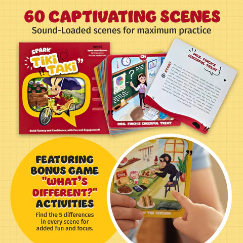 This articulation game includes 60 vibrant picture scenes that keep kids engaged while they practice target sounds at the word, phrase, and sentence level. Each scene also features short stories for using sounds in context and fun “What’s Different?” activities to build listening and sound awareness. Tiki Taki turns articulation practice into an interactive, high-interest experience children love.