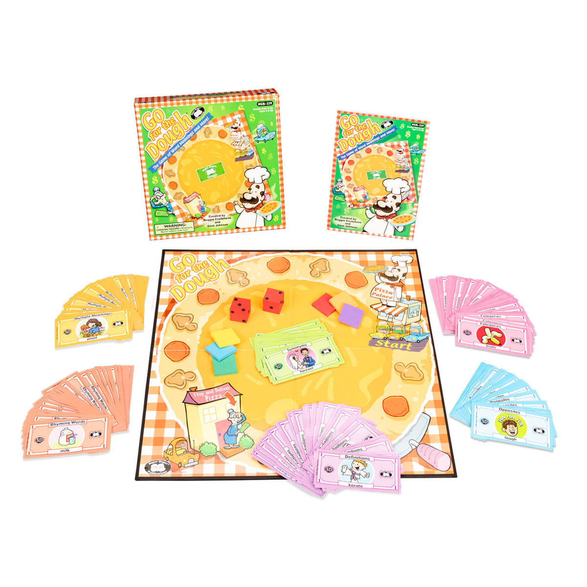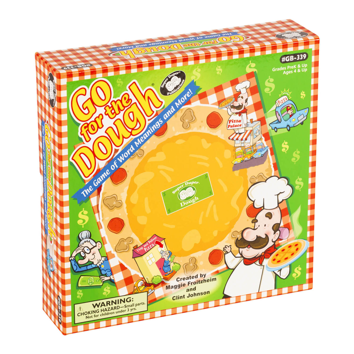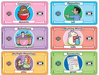 Players start at the Pizza Palace. As students drive their cars around the board to deliver their imaginary pizzas, they choose Super Dough Dollars. Each of the 480 Super Dough Dollars reviews a language skill that is crucial in expanding word knowledge. Best of all, the Dollars feel like real money—and won't tear or rip!