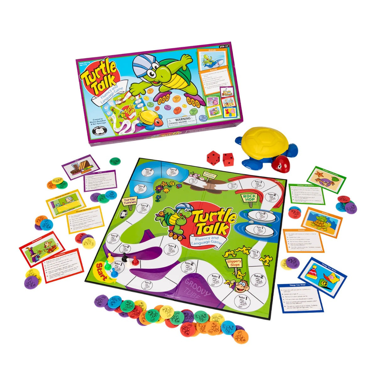 In this innovative fluency and language game, players pick a card, answer a skill level question, roll the die, "skate" around the board, and collect Turtle Tokens as they go! Turtle Talk is ideal for non-readers also.