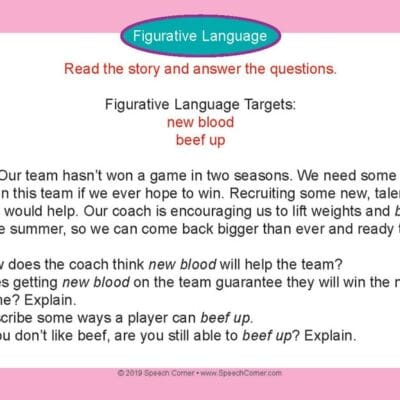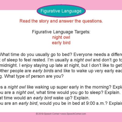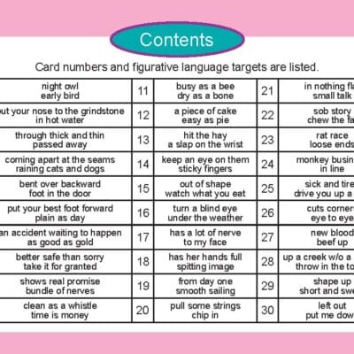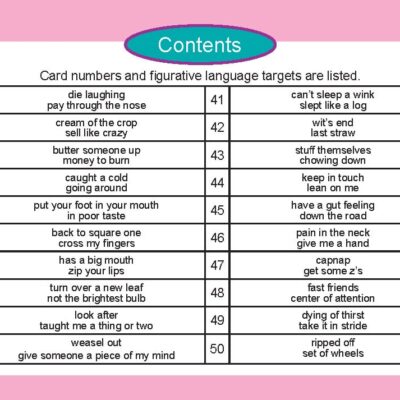 Each card presents two figurative language expressions in context, followed by four guided questions to promote discussion, comprehension, and expressive use. This resource is ideal for working on idioms, metaphors, and other nonliteral language forms in a way that resonates with learners.